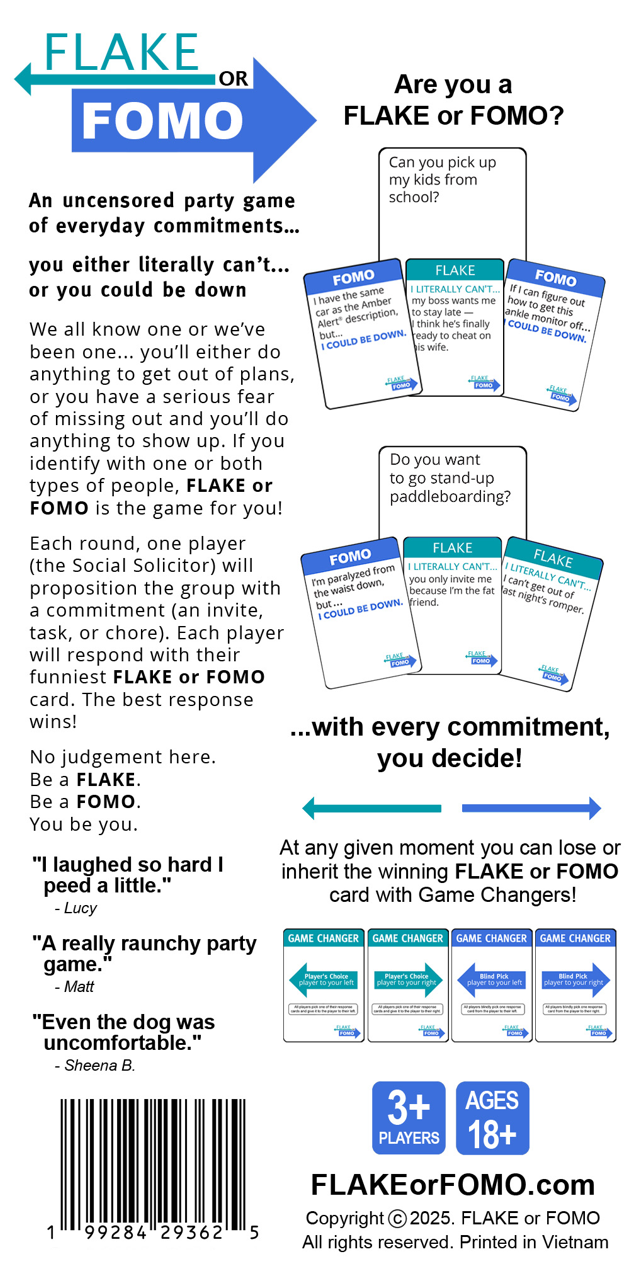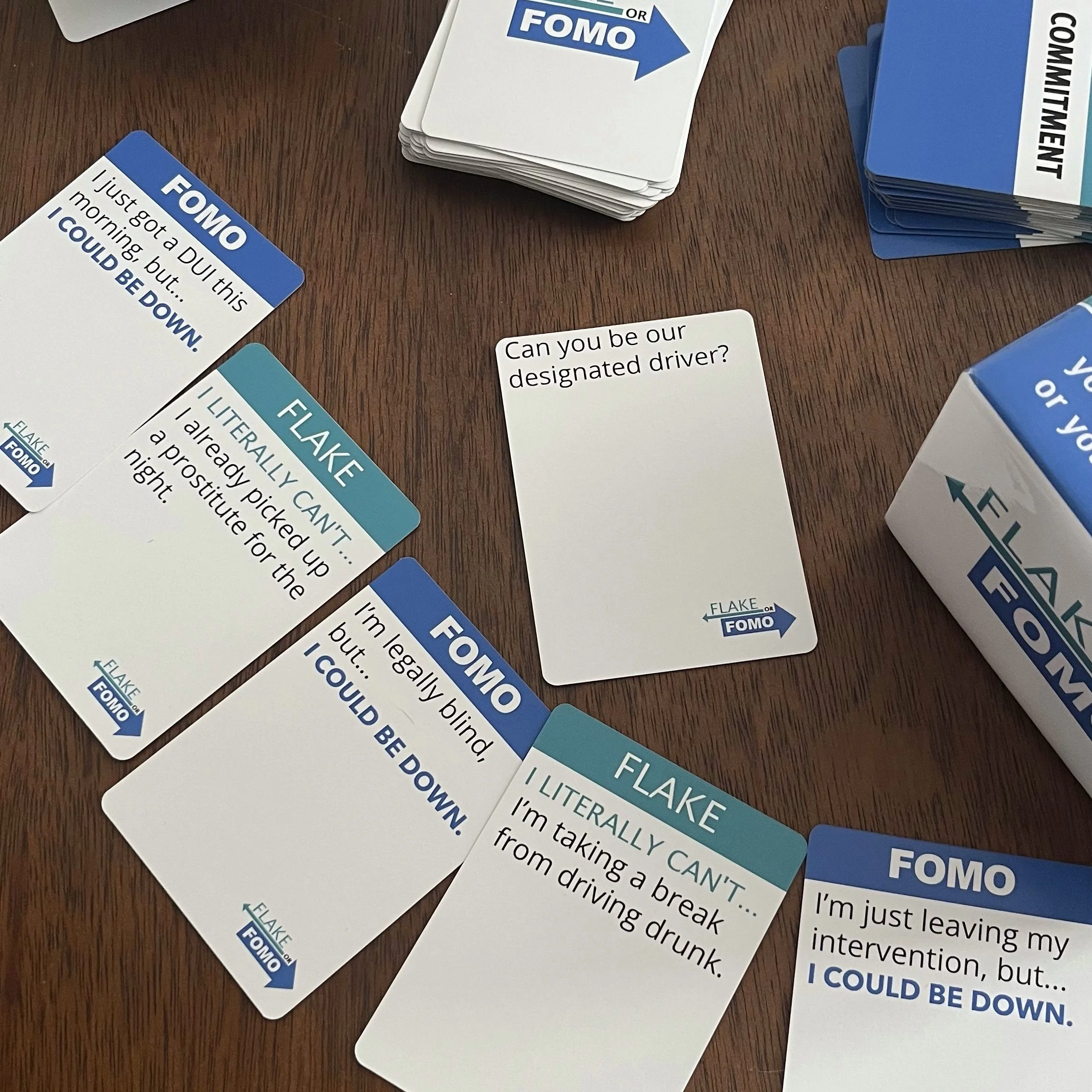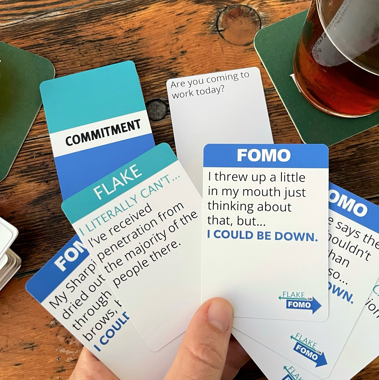 We all know one or we’ve been one… you’ll either do anything to get out of plans, or you have a serious fear of missing out and you’ll do anything to show up. If you identify with one or both types of people, FLAKE or FOMO is the game for you!